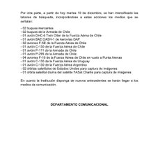 Por sua vez, o porta-voz da Direção Meteorológica do Chile, Arnaldo Zúñiga, disse que as condições para as próximas 72 horas "parecem melhores, as ondas e o vento tendem a diminuir, o clima melhora na busca".